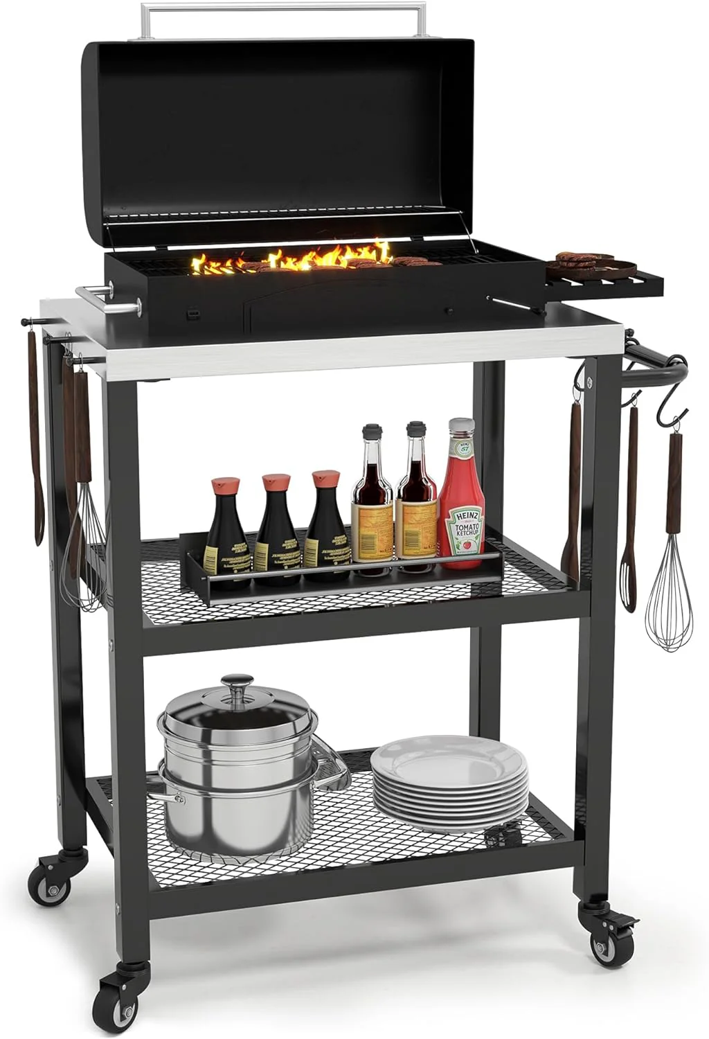 Stainless Steel Grill Cart - Pizza Oven Stand with Wheels, Three-Shelf Outdoor Trolley